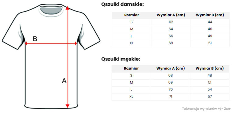 Panie, które preferują luźniejsze fasony, mogą zamówić męską koszulkę w swoim rozmiarze - w ten sposób osiągną efekt “oversize”. Męskie qszulki również są subtelnie taliowane, dlatego Panom zalecamy wybór rozmiaru, który zwykle noszą, ewentualnie o 1 rozmiar większego dla luźniejszego efektu.